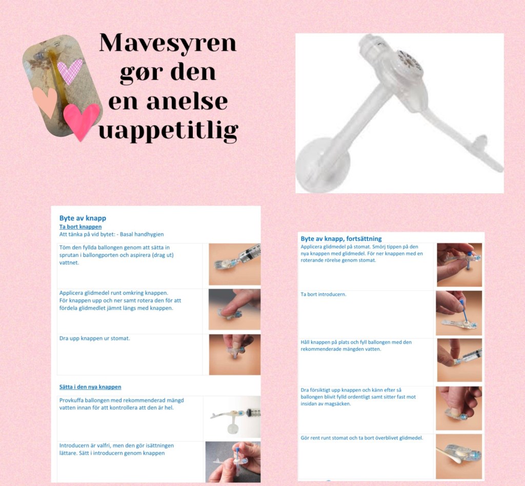 Så instinktivt røg knappen ind igen og plaster på så den ikke ‘trillede’ ud. Og så eller dobbelt håndvask og afspriftning, tjekke at den nye knap fungerede, lidt glidecreme for ikke at irritere huden for meget og så ellers svup, ud med den gamle og ind med den nye, 8 ml sterilt vand, og derefter tjekke med stetoskopet, at den siger de rigtige gurglelyde, når man puster lidt luft ind. For at dobbelttjekke plejer jeg, at trække lidt mavesyre op, og tjekke det på lakmuspapir, for så er man da helt hundrede på, at den ligger rigtigt.