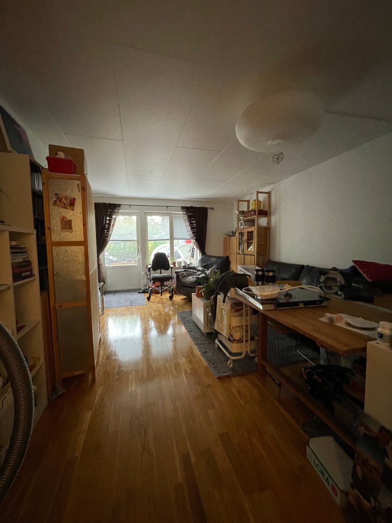 Vores fine ellers så overkommelige stue, der endelig havde fået gulvplads igen, fungerer nu som opbevaring for 1/2 køkken og en spisestue. Og jeg kan næsten ikke være i det🤯