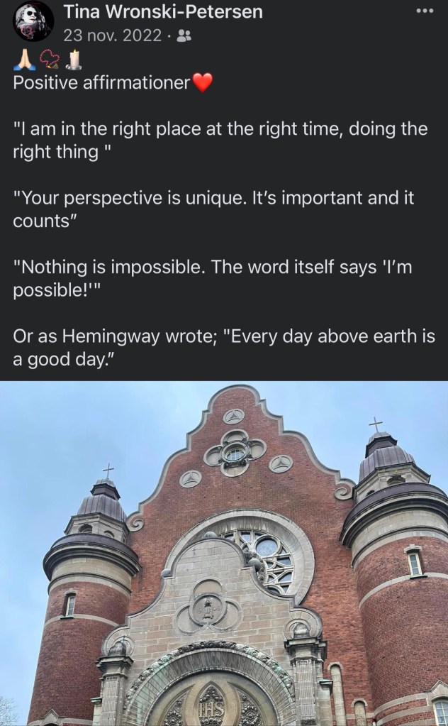 Der blev tændt mange lys. Mange reflektioner. Mange sessioner med Basal Kroppskännodom tur/retur👩🏻🦼 Det gode ved dårlige tider er, at man glemmer, hvor dårlige de var, når de bliver bedre. Livet er en rutchebanetur, med bump på vejen, når først billetten er indløst, er det bare at nyde turen, for ingen slipper for både op-og nedture, uanset hvor meget vi ønsker det. 🌼 Min erfaring er, at der ikke findes noget mere irriterende end nogen der velmenende siger; “Hvad der ikke dræber dig gør dig stærkere” eller “Alt sker af en årsag” alt sammen sætninger, der når de falder, fremprovokerer lysten til en high five i ansigtet … med en stol. Hurra for selvkontrol. 🌺 Jeg forbeholder mig retten til, lommefilosofisk, at citere Nietzsche (Den modstand, der ikke slår dig ihjel – gør dig stærk.) når det bekommer mig. Og jeg tror på kausalitet og fatalisme, men det er ikke den omsorg jeg søger, når livet gør ondt. Men når støvet har lagt sig og tiden gjort sit uundgåelige og mirakuløse helingsarbejde, begynder en ny virkelighed at tage form, små glimt af meningen med alle de bumpede veje. Hårde tider og modgang giver os mulighed for at opbygge styrke og mod på en måde, de gode tider ikke gør. 🌸 Hårde tider tvinger os til at grave dybere, end vi nogensinde vidste vi kunne… og vi kommer altid ud på den anden side (før eller siden). Hårde tider bygger mod… mod til at møde og håndtere det, vi aldrig ønskede at møde og håndtere. Hvad vi troede, vi aldrig kunne møde og håndtere. Det gør os mere modige. Og mere empatiske. Vi kan forstå andres lidelser på en måde, vi aldrig kunne få før. Så måske skal vi gøre os selv den tjeneste og acceptere det uundgåelige, at livets veje har bump. Og at vi lærer noget af disse tider, som vi ikke lærer, når alt går “perfekt“. At det, vi tror, vi ikke kan overleve eller kapere, klare vi. Og vil vi. Selv om det virker umuligt, når vi står midt i det. Ved at vide, stole på og acceptere, at det sker for os alle, og evnen til at tilpasse os er en uundgåelig del af denne lange, vilde rejse, vi kalder livet, måske skal vi danse lidt mere gennem regnen. 💃🏻☔️ Livet vil aldrig blive levet i en permanent solbeskinnet glød, der vil altid være regn, haglstorme og indimellem en orkan eller to. Det er ved at overleve disse vejr lag , vi får perspektiv og styrke, en indsigt vi ikke kunne have fået på nogen anden måde. Vi lærer ting af modgang, vi ville aldrig have opdaget, hvis ikke vi havde haft modet til at give den indre diamant facetter. 💎 Vi får et perspektiv, hvorfra vi virkelig, kan værdsætte de gode tider. For at værdsætte lyset, er der nødt til at være mørke, modgang for at værdsætte medgang, regnvejr for at værdsætte solskin. Idag gør livet ondt, men det er okay, for imorgen er idag igår.